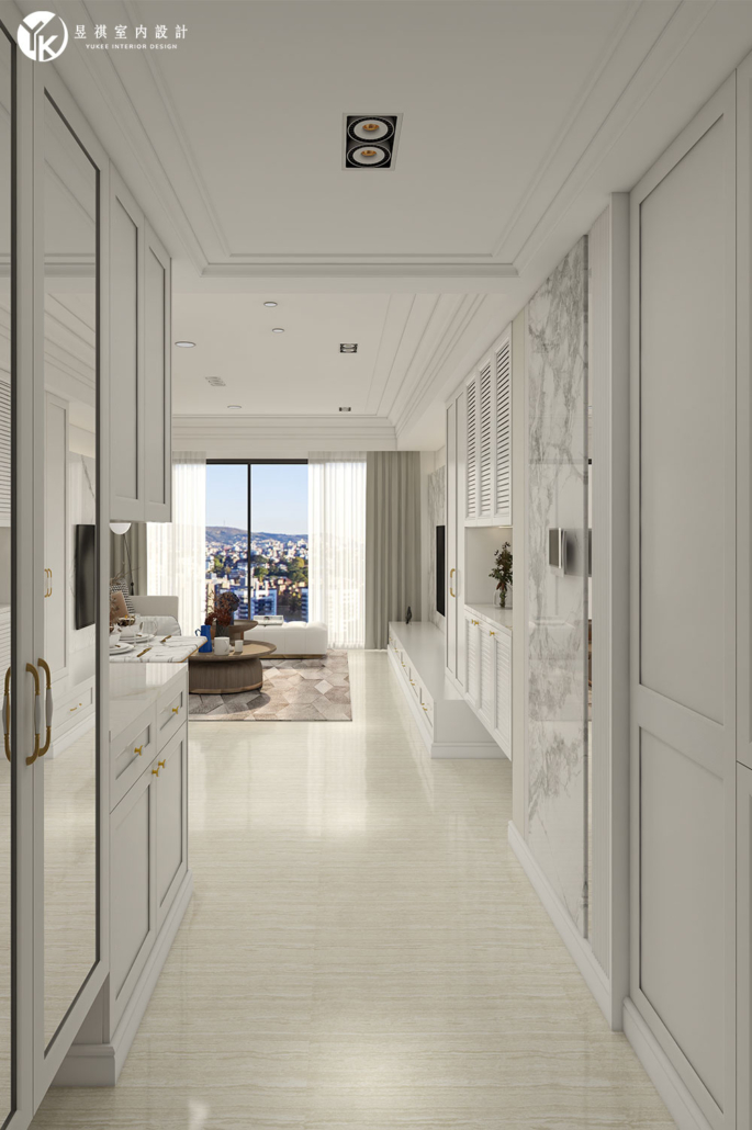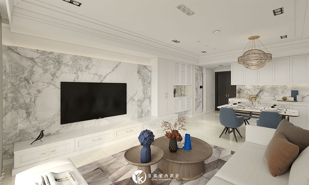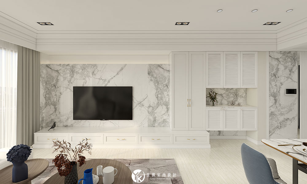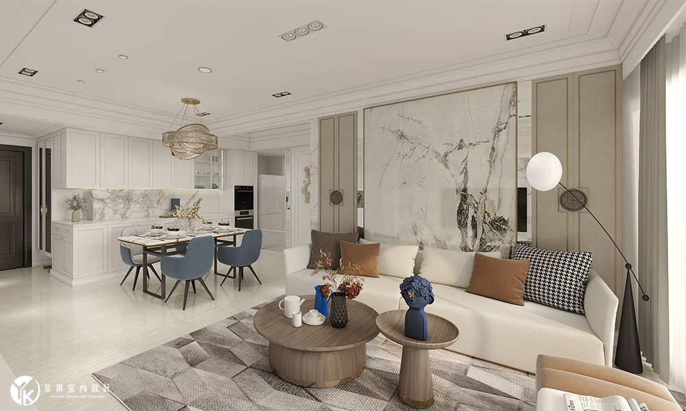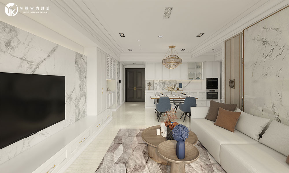 整體設計風格以 現代輕奢風格室內設計 為主軸,透過大理石紋理、溫潤木質與柔和色系,營造出優雅且舒適的生活氛圍。