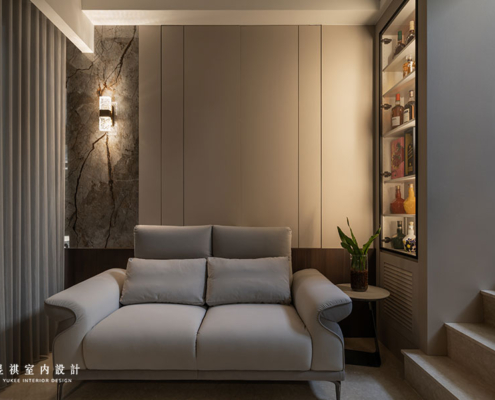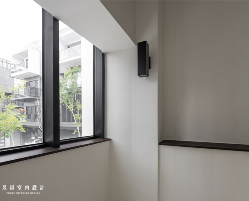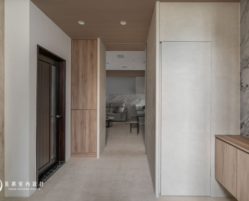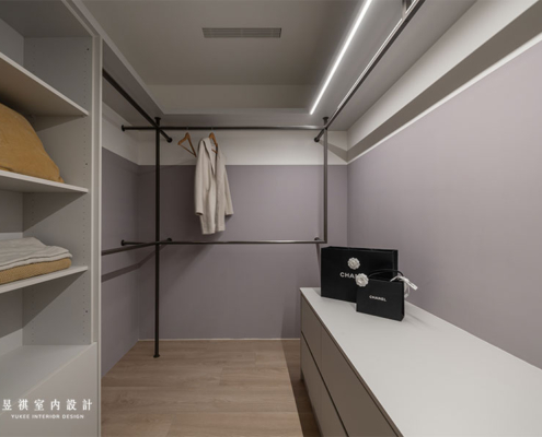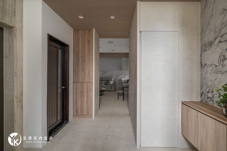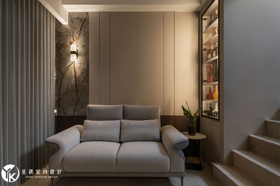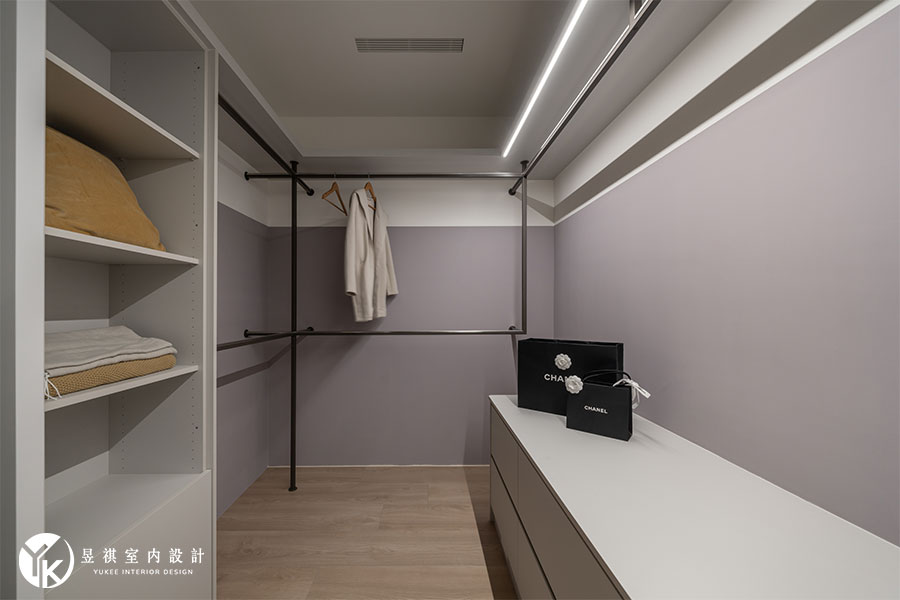 2樓規劃設計儲藏室及收納櫃;儲藏室的入口也改為隱藏門設計,創造連續不被截斷的放大視覺,也方便屋主收納箱型包裹以及各式家電。