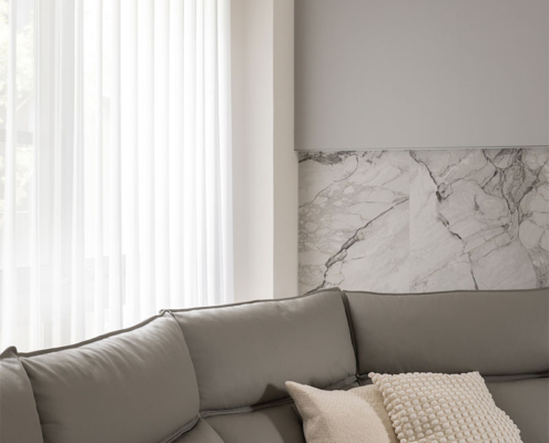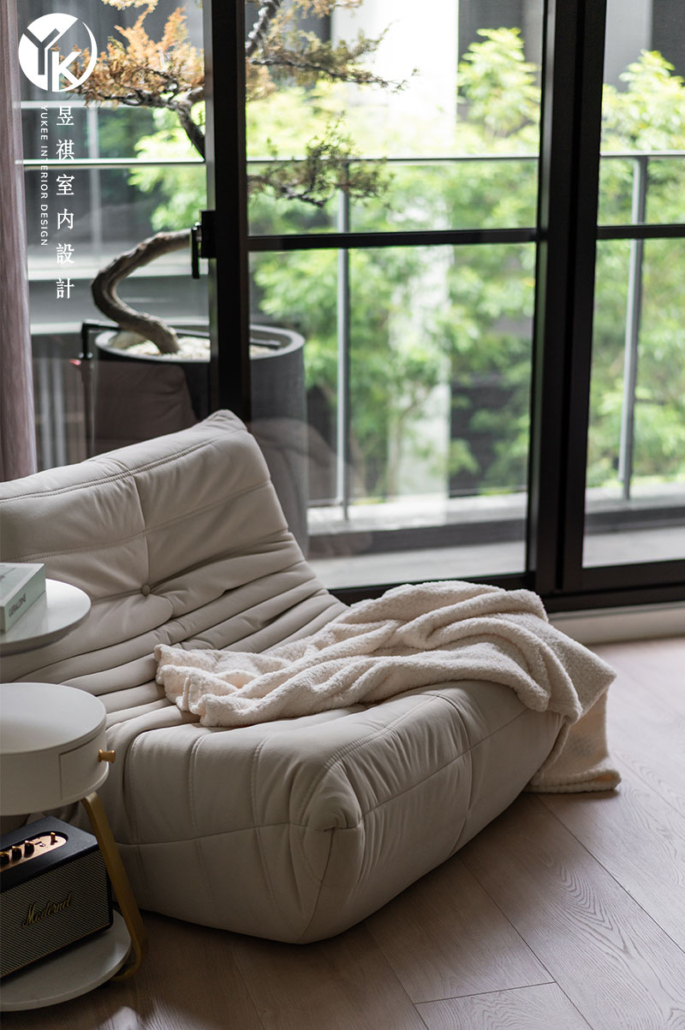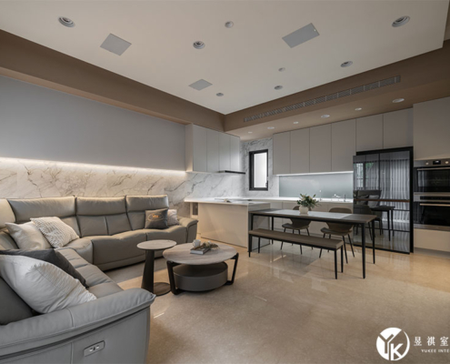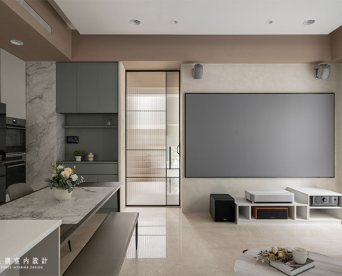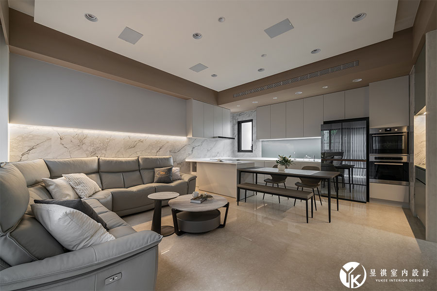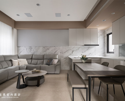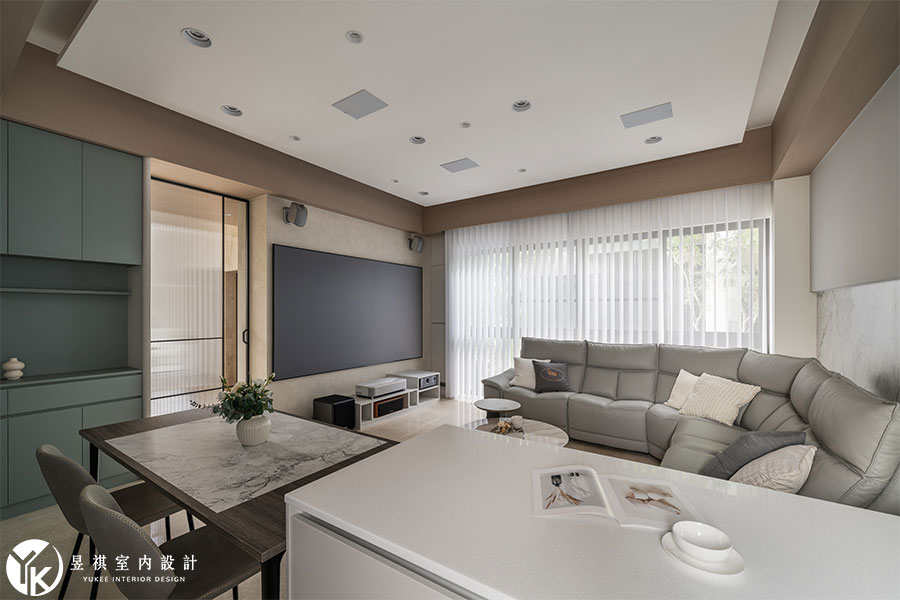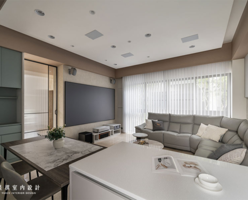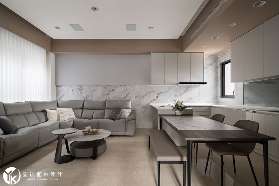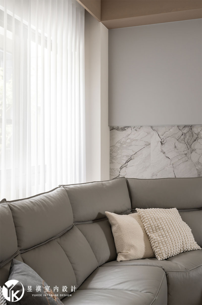 在這現代風新成屋中,公領域採開放式設計,融入大板磚優雅石紋和司曼特塗料的藝術手感,配色清新,大片 穿透簾 同時將充沛光線引入室內,營造出恬淡舒適的居住氛圍,成為家人可自在相伴的美好居所。