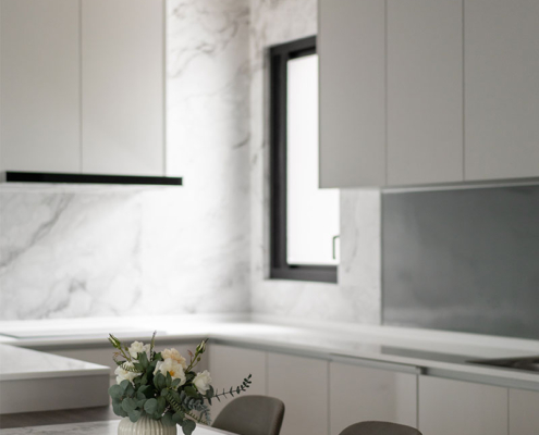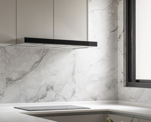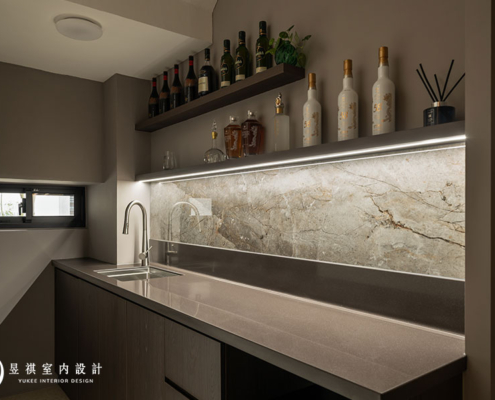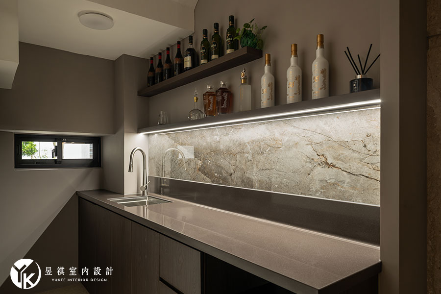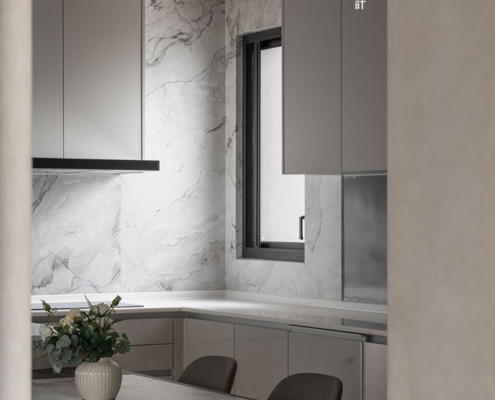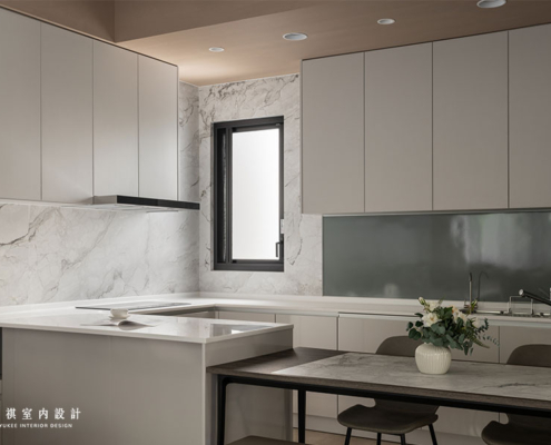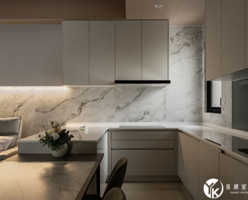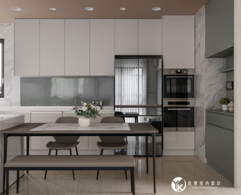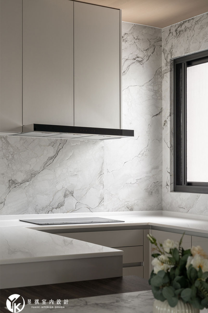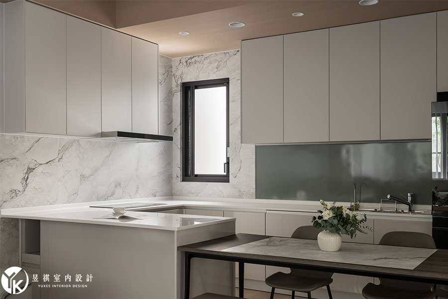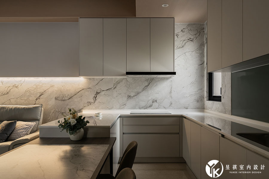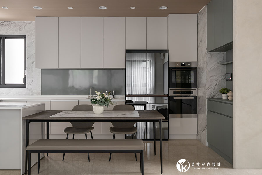 開放式廚房與客廳互動性高,結合收納設計,並搭配 琺瑯板,在表面零毛細孔的特性下,污垢、油漬都非常好清潔和維護,且本身所附的磁吸功能更有效擴大了收納機能。