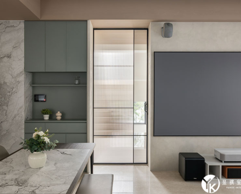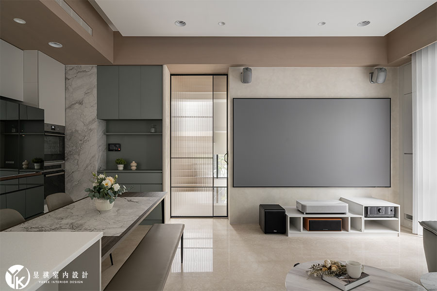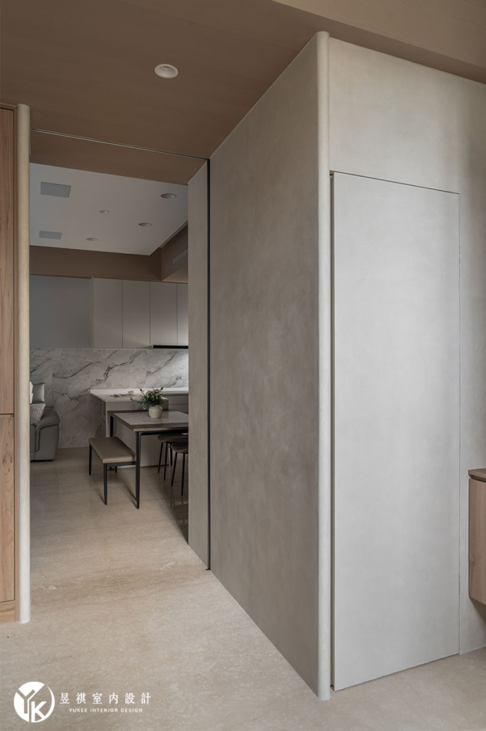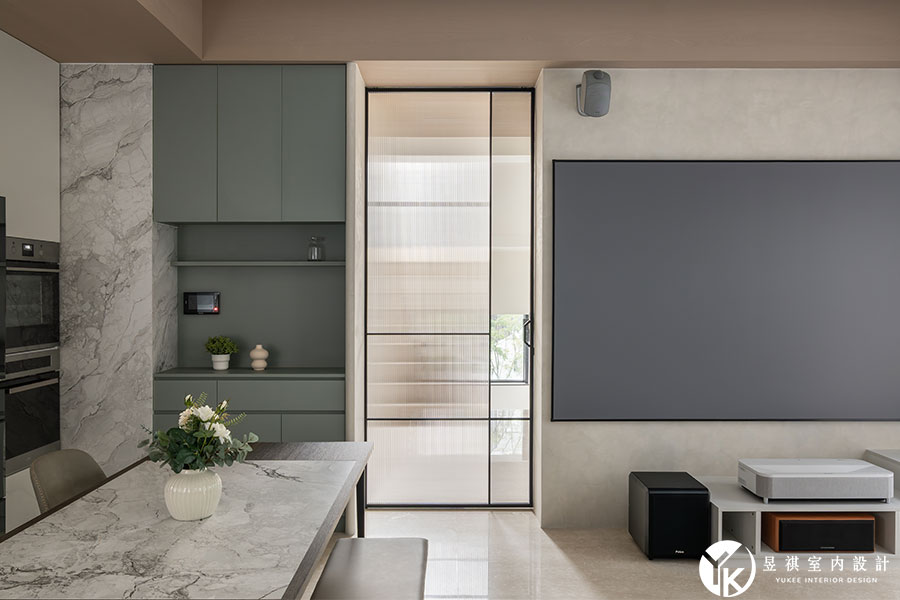 進入客餐廳的入口是 長虹玻璃拉門,讓光線能相互穿透照亮走道,也消弭了隔間造成的視覺隔閡、但保有一定的隱私性。