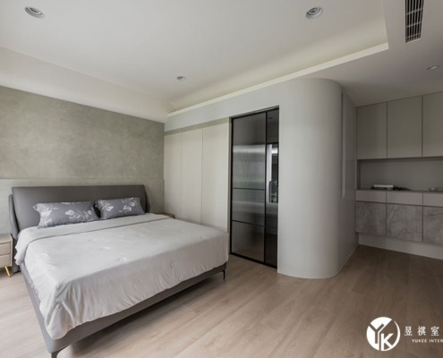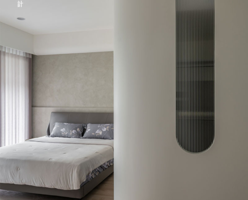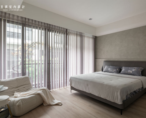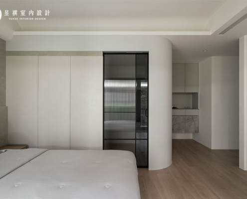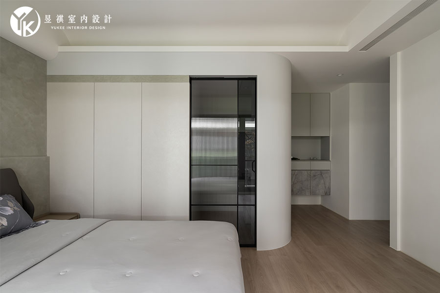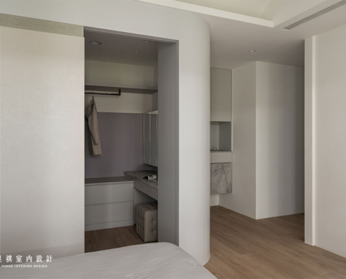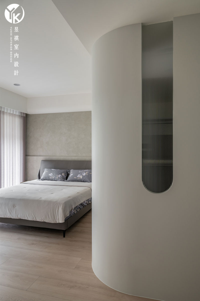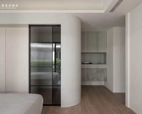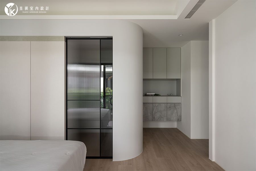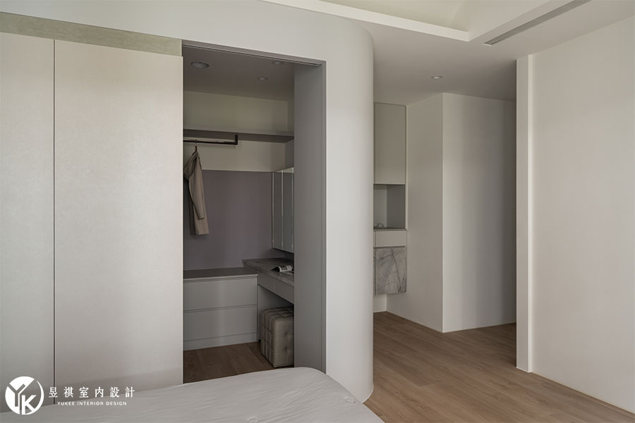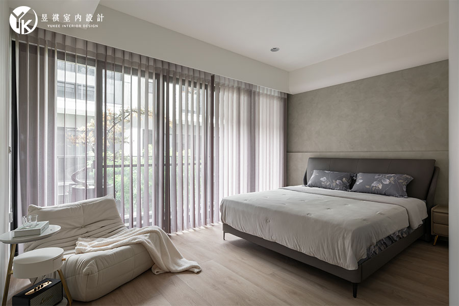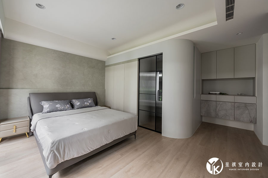 主臥設計則注重空間感與採光,延續公領域質感的藝術塗料,大面落地玻璃加裝紗簾,讓日光灑落空間,營造出舒適放鬆的氣息。圓孤設計巧妙地規劃出深度足夠的化妝台和更衣室,提供充足的生活機能;沉穩的灰色調帶出靜謐氛圍,這裡是夫妻兩人專屬的休憩角落,讓人得以在此自在沉澱。