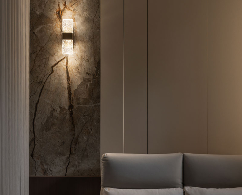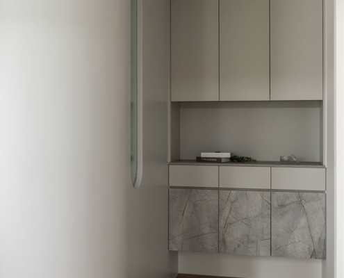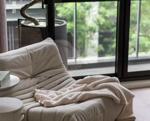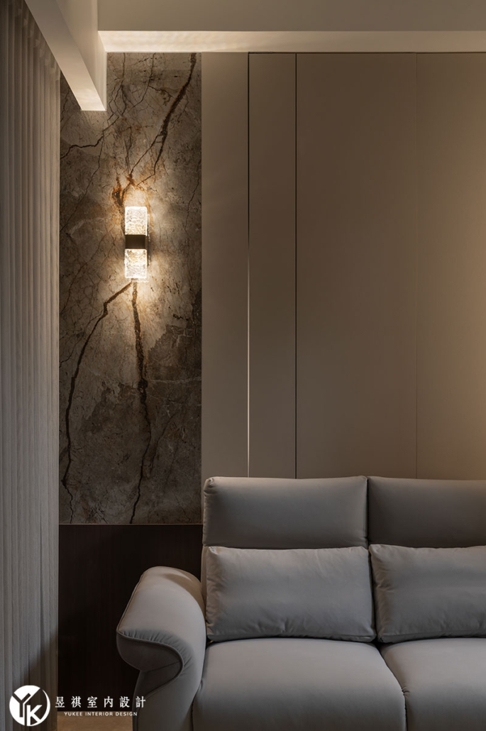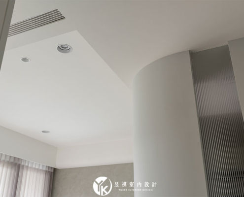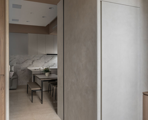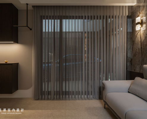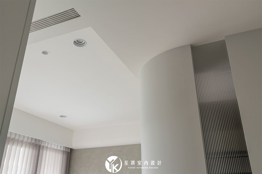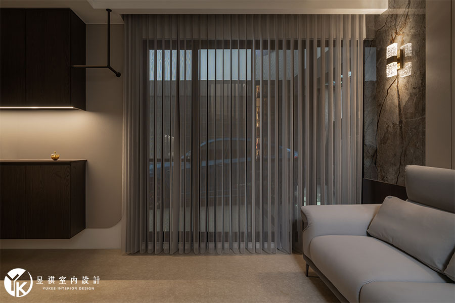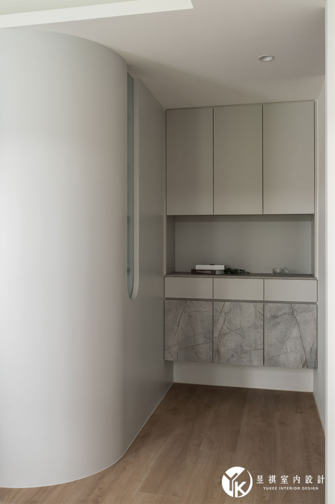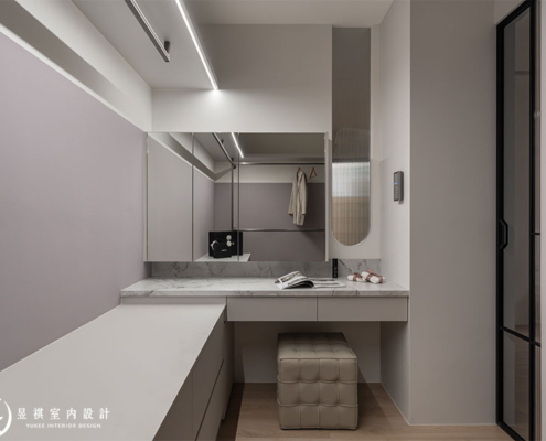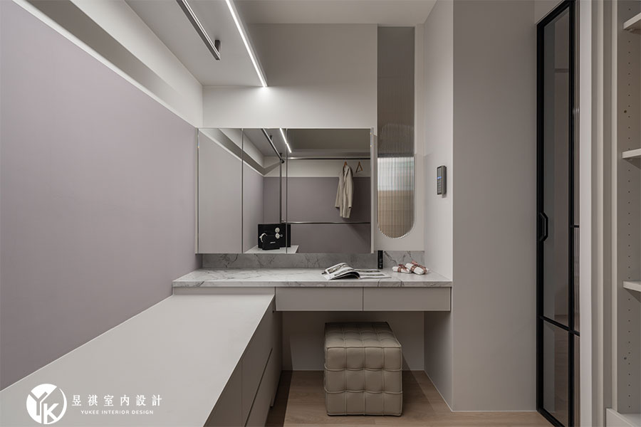 主臥設計則注重空間感與採光,延續公領域質感的藝術塗料,大面落地玻璃加裝紗簾,讓日光灑落空間,營造出舒適放鬆的氣息。圓孤設計巧妙地規劃出深度足夠的化妝台和更衣室,提供充足的生活機能;沉穩的灰色調帶出靜謐氛圍,這裡是夫妻兩人專屬的休憩角落,讓人得以在此自在沉澱。